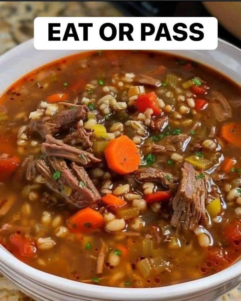 Cover the pot and let it simmer on low heat for 1 to 1½ hours, stirring occasionally, until the beef is tender and barley is fully cooked. Skim foam or fat from the surface if needed.