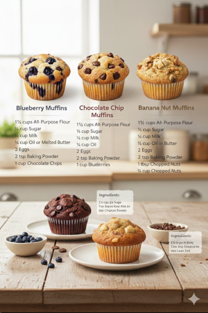 • 1¾ cups All-Purpose Flour • ¾ cup Sugar • ½ cup Milk • ½ cup Oil or Melted Butter • 2 Eggs • 2 tsp Baking Powder • 1 cup BlueberriesInstructions 1. Preheat oven to 180°C (350°F). Line muffin tray. 2. Mix flour, sugar, and baking powder. 3. Whisk milk, oil, and eggs separately. 4. Combine wet and dry
