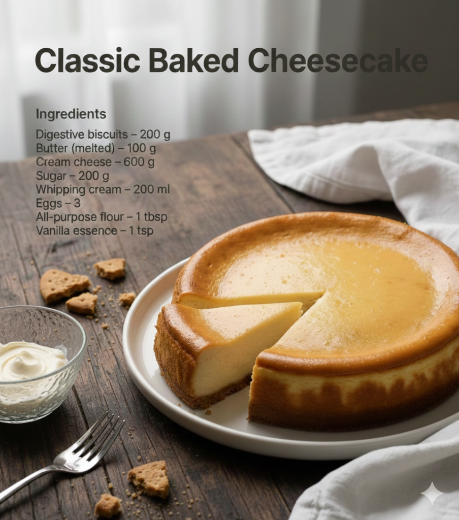 Digestive biscuits – 200 gButter (melted) – 100 gCream cheese – 600 gSugar – 200 gWhipping cream – 200 mlEggs – 3All-purpose flour – 1 tbspVanilla essence – 1 tsp