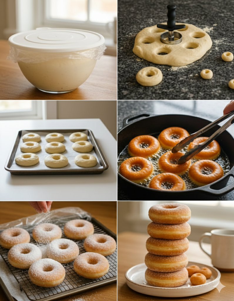 Second Proof: Place the donuts on a floured baking sheet, cover them, and let them rise again for another 30 minutes.