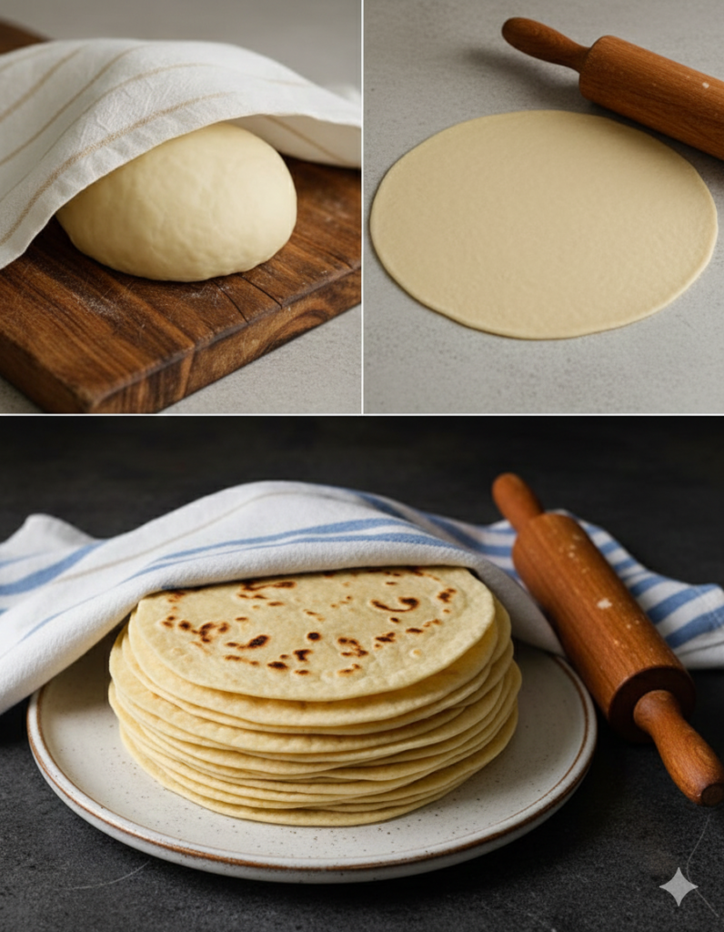Heat a heavy skillet or cast-iron griddle over medium-high heat. Place the dough circle on the dry pan. Once small bubbles begin to form on the surface, flip it immediately to the other side. Do not overcook, or they will become crunchy instead of soft.